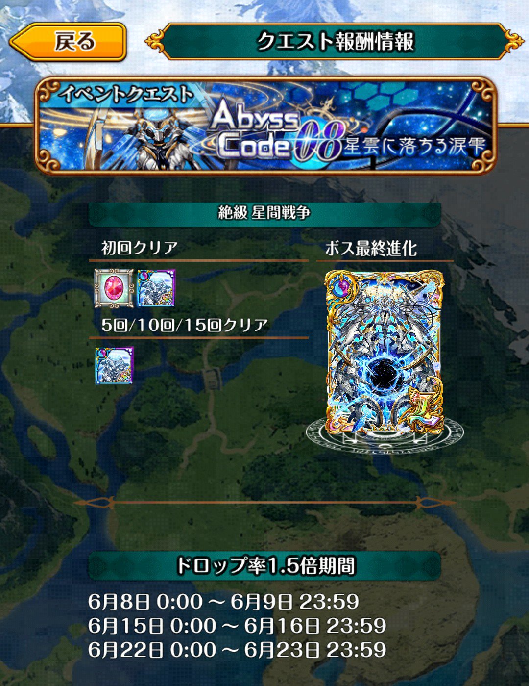 ドロップ1.5倍期間ですが、6/22-23は魔道杯なので、あとは6/15-16しかチャンスがなさそうです。