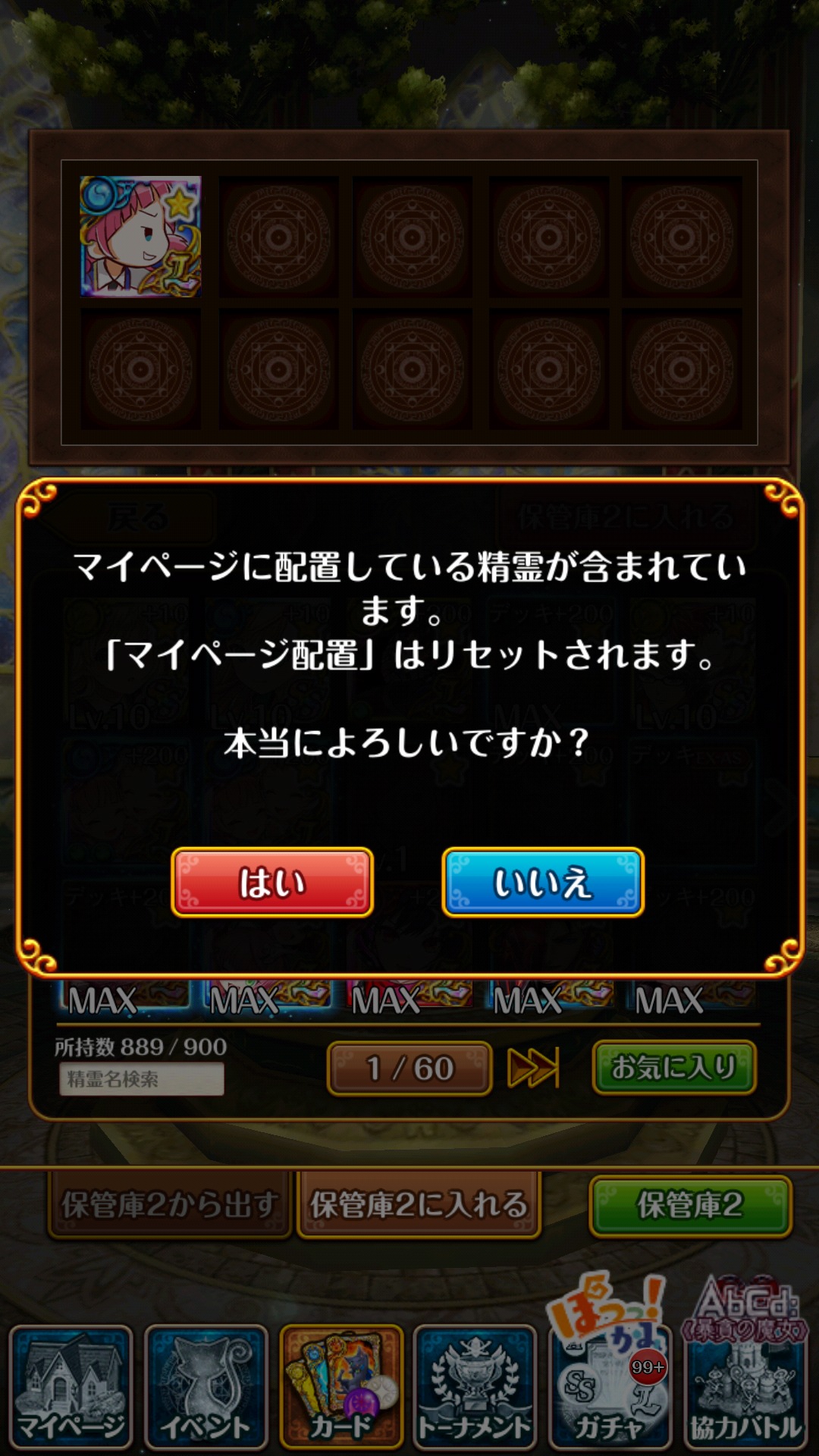どうやら、手持ちから無くなった精霊はマイページに設置できないというのが結論のようです。
